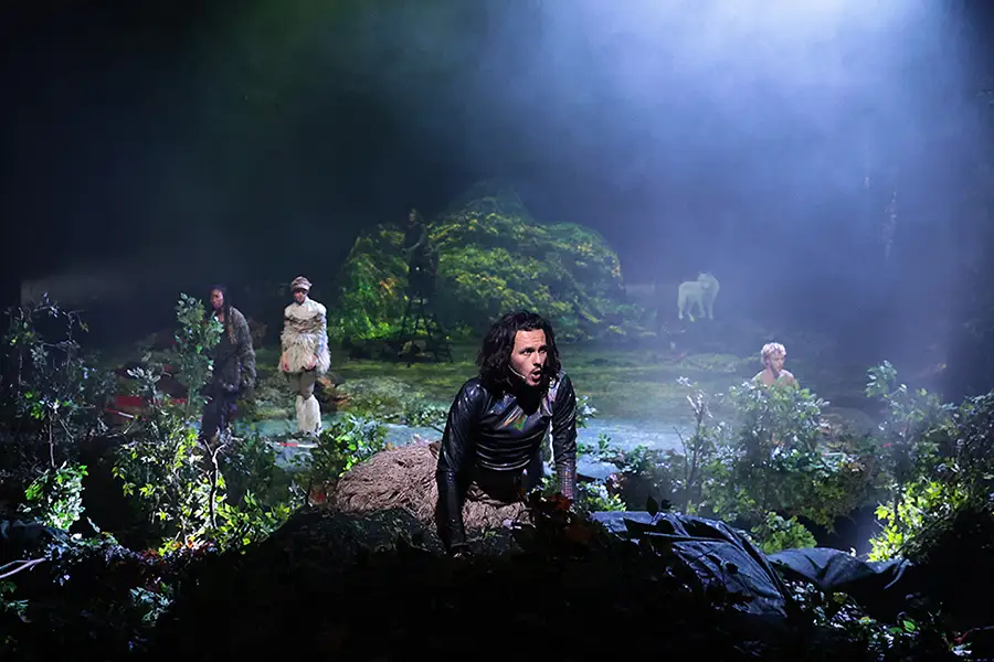 In de theaterzaal gedijen nu flora, fauna, bacteriën en lichtgevende schimmels. Het rode pluche van de theaterstoelen is onderdeel geworden van een levend ecosysteem. Onder het maanlicht huilt een wolf en wagen zes mens-hybriden zich uit de schaduw, het zijn dansers en zangers, fluïde wezens in dit futuristisch biotoop. Als onderdeel van het ademende landschap resoneren ze met lang vergeten radiogolven, met ritselende bladeren en met de filmische muziek van onze huiscomponist Gary Shepherd, ook restanten van romantische liederen van Franz Schubert vibreren door dit biotoop. Beeldend kunstenaar Heleen Blanken ontwikkelde driedimensionale projecties die het theater doen overwoekeren. Diep in vochtige, trillende, spelonkachtige diepten, op de bodem van een post-apocalyptische realiteit, krijgt de wilde belofte van een onvoorstelbare toekomst geleidelijk vorm. Een ruimte vol leven, potentie en verwondering.